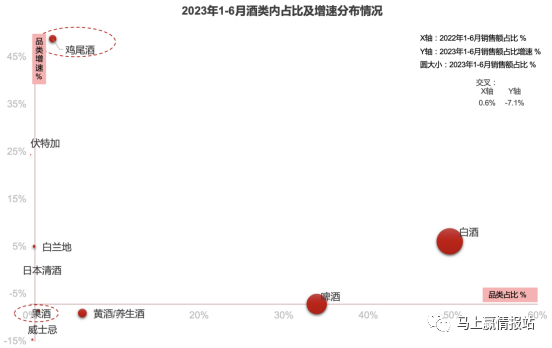 酒类类目作为2023年1-6月销售额占比提升较大的类目,对便利店、食杂店的销售额增速恢复有着重要的拉动作用。其中,根据马上赢研究院提供的数据,目前销售额占比优势尚不明显的鸡尾酒以49%的销售额占比增速排至第一位,远超其他品类。
