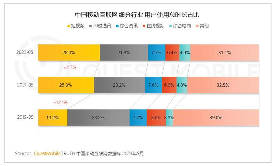 QuestMobile数据显示,截至2023年5月,全网12亿用户日均使用时长达7.1小时,其中用户使用总时长占比中短视频稳居第一达到28%。粗略计算,10亿用户每人每天要观看2小时视频,视频平台正在将用户引向电商、餐饮、旅游等多个垂直赛道。