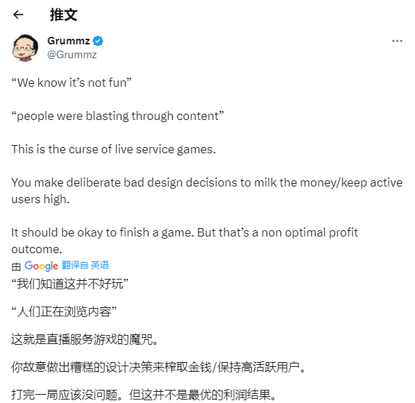 甚至连《暗黑2》的制作人Mark Kern都忍不住发推,锐评该游戏就是个半成品,“利用大量糟糕的决策迫使玩家氪金并保持高活跃度。做完一款游戏根本没有问题,但这并不是榨取最大利润的最优解。”他认为《暗黑4》就是在线游戏的牺牲品。
