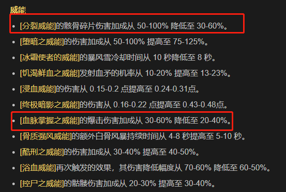 比如死灵法师的牺牲骨矛流BD的构建主要依靠分裂威能以及血脉掌控威能提供超高的暴击增伤,然而本次补丁直接将两个威能的数据削弱了近一半。作为进本碰一下即死的玻璃体质,死灵原本的思路是利用超高的爆发秒怪来提高生存的容错,在本次更新后,伤害只有原本不到二分之一的情况下,秒怪成为了一种奢望,从而导致在高等级的梦魇地下城的生存难度大大提升。