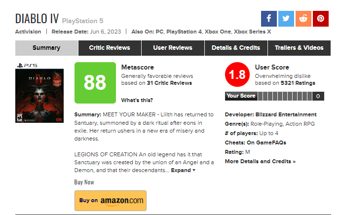 上线当天M站的玩家评分就遭遇了千条差评的狂轰乱炸,《暗黑4》的玩家评分以肉眼可见的速度快速下跌,最终成功突破2分底线,与《指环王:咕噜》并驾齐驱,并称为本年度的“卧龙凤雏”。