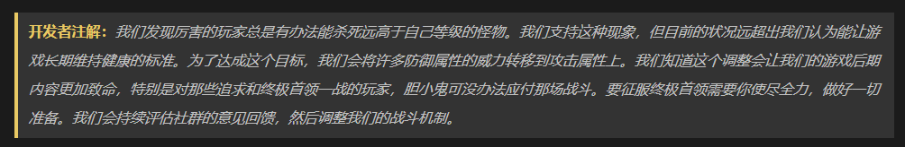 在暴雪看来,他们很高兴的看到厉害的玩家总是有办法杀死远高于自己等级的怪物,但目前的状况远超出他们认为能让游戏长期维持健康的标准。因此,经过慎重考虑,他们一致决定将防御属性转移到了伤害数值上,因为想要征服终极的BOSS玩家必须用尽全力,胆小鬼可没办法应付这样的战斗。