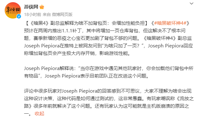 而被玩家从开服吐槽到现在的背包页数量以及宝石栏位,自从上次开发者篝火活动确认将在第一赛季前上线之外,直到现在不见任何踪影。《暗黑4》的副总监甚至亲自回应,表示增加背包页将会产生极大的内存开销,影响游戏性能。因为当遇到其他玩家的时候,将会加载他背包中的所有物品,然而立马就有玩家嘲讽好几年前的《流放之路》早就解决了这个问题。