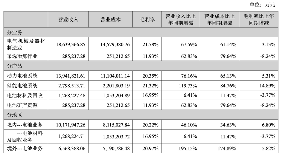财报数据显示,储能电池业务营收为279.85亿元,毛利率为21.32%,相比上年同期均有较大幅度的增长。储能业务占到总营收的14.79%。