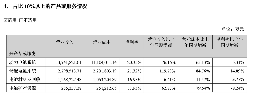 值得一提的是,“宁王”虽然有矿,但电池矿产资源带来的营收仅为28.52亿元,占总营收的比重为1.5%,并且毛利率也是各项业务当中较低的,仅为11.93%。