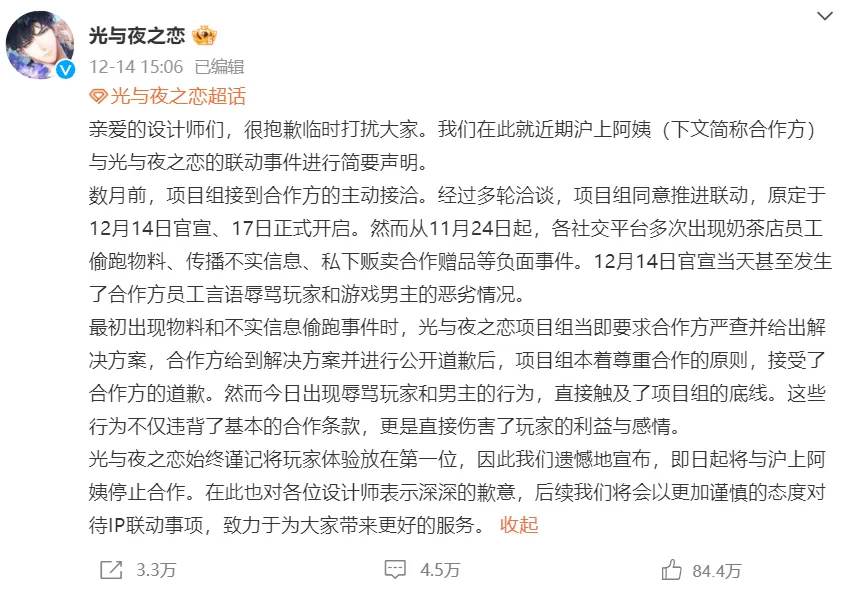 2022年12月14日,沪上阿姨与《光与夜之恋》开启联名合作仅3个小时,就被游戏方火速叫停。