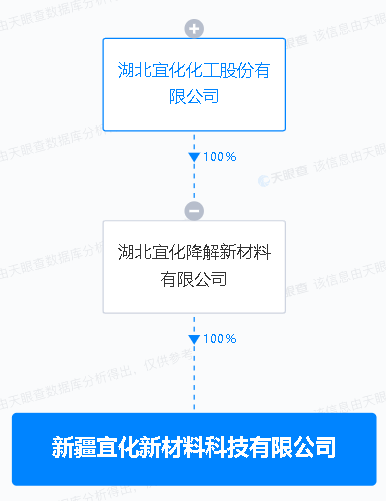 天眼查APP显示,新疆宜化新材料科技有限公司成立,法定代表人为李祯,注册资本1亿元,经营范围包含:日用百货销售;建筑材料销售;饲料原料销售;饲料添加剂销售等。天眼查股权穿透显示,该公司由湖北宜化间接全资控股。