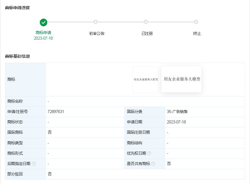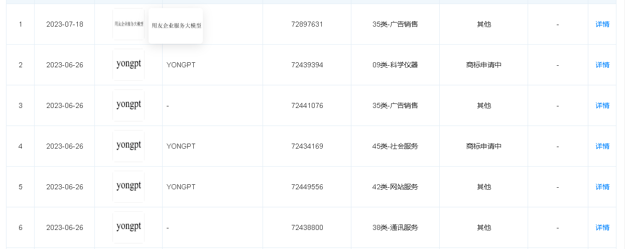 天眼查App显示,近日,用友网络申请“用友企业服务大模型”商标,国际分类为广告销售,当前商标状态为申请中。不久前,该公司还申请了多个“YONGPT”“YONYOUGPT”商标,国际分类涉及科学仪器、网站服务、广告销售等,当前商标状态也为申请中。