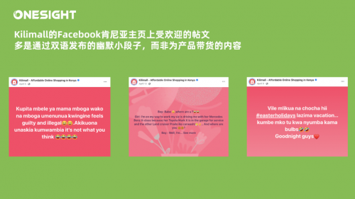 同时由于天生的乐观精神和热情喜爱幽默的表达方式,Kilimall的Facebook肯尼亚主页上受欢迎的帖文多是通过双语发布的幽默小段子,而非为产品带货的内容。
