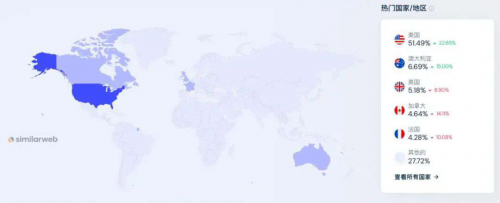 这一点从其网站的流量主要来源地也可以看出来。美国、澳大利亚、加拿大、英国、法国是其核心受众的主要来源地。