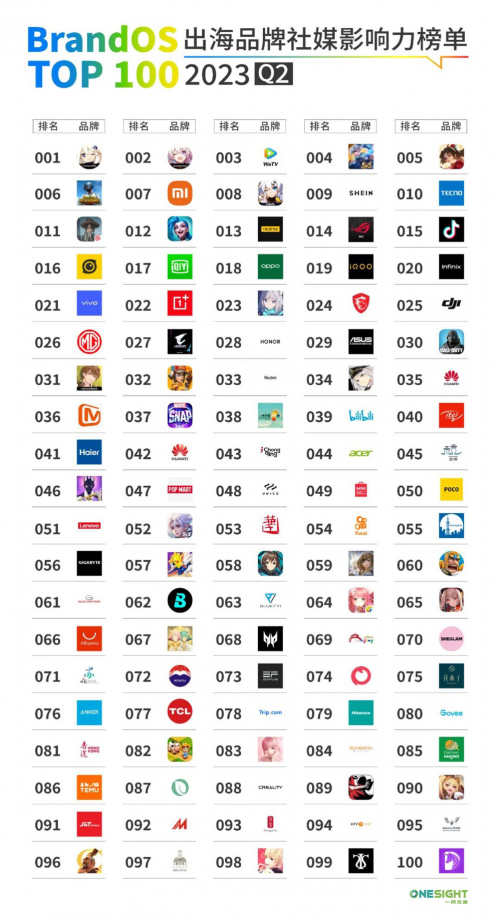 而上述两个品牌之外,在《2023Q2 BrandOS出海社媒影响力榜单》的总榜及电子商务、消费电子、工业制造、游戏、应用类(非游戏)、旅游服务及大细分行业榜单中还有更多令人眼前一亮的出海品牌。