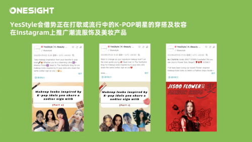 因此除了K-Beauty之外,YesStyle在社交媒体营销中还充分借势K-POP(韩国流行音乐)在欧美市场的上升趋势,结合在欧美地区大热的K-POP偶像组合成员的穿搭和妆容来推广平台上的产品。