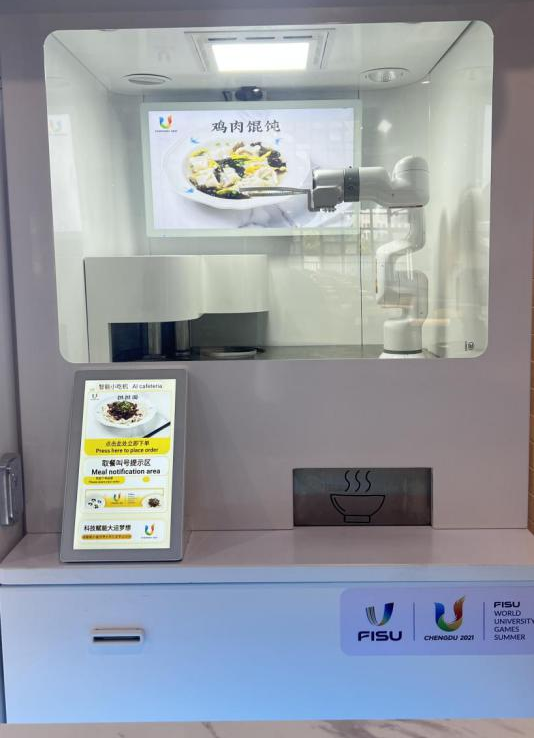 食堂配备的智能小吃机器人也增强了食堂的趣味性与参与感。智能小吃机器人集全自动接单、烹饪、出餐、叫号等功能于一体,能高效制作熊猫汤圆、担担面、红烧牛肉面等当地小吃,让各国和地区运动员感受“世界美食之都”的魅力。
