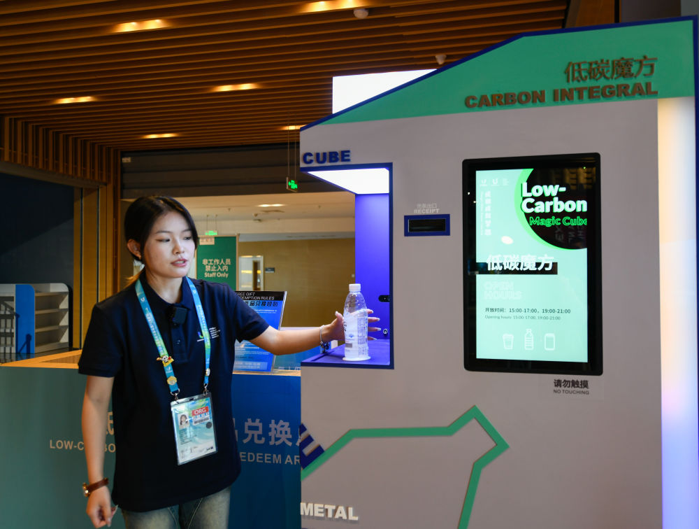 在大运村休闲商业区放置的“低碳魔方”互动装置引人注目,该装置运用太阳能转换电能、AI即时对话、判定可回收物品兑换碳积分分值等新兴技术应用与低碳环保概念结合,运动员和嘉宾将矿泉水瓶、易拉罐等可回收物放置回收点,即可自动扫描并打印出碳积分小票,凭小票可以兑换特色小礼品,鼓励参赛运动员积极参与环保活动,践行绿色低碳理念。