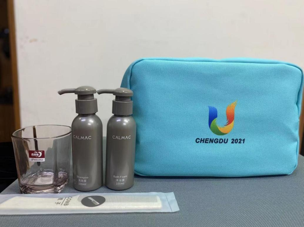住宿区绿色细节满满。大运村居住区共分为A、B、C三个区域,共10栋公寓。公寓房屋内设备设施齐全,运动员们可以直接“拎包入住”。房间内配备了洗漱包,其中沐浴液、洗发水等洗护用品为100毫升容量定制款,相较于酒店普通小包装更环保。