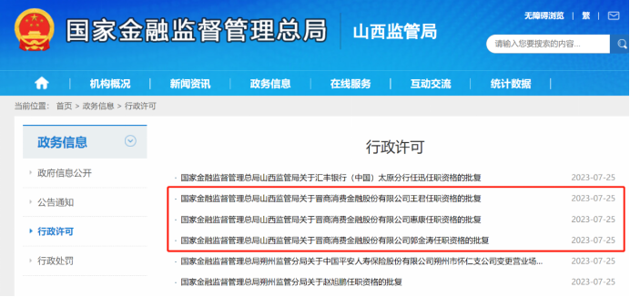 最近的一次高管变动出现在晋商消金。7月25日,山西银保监局核准了王君、惠康和郭金涛三人的晋商消金董事的任职资格。