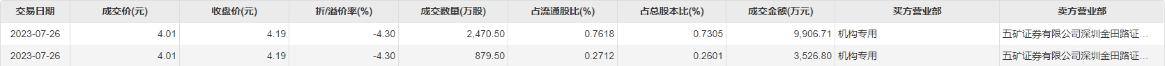 新里程7月26日大宗交易成交3350万股,成交额1.34亿元,占当日总成交额的80.36%,成交价4.01元,较市场收盘价4.19元折价4.3%。