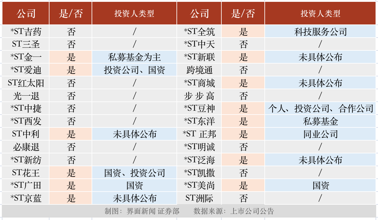 *ST广田公布仅一家重整意向投资人即深圳市特区建工集团有限公司,该公司为深圳国资委全资控股;*ST美尚的意向投资人为深圳市高新投集团有限公司,该公司同样为深圳国资委控股公司;*ST爱迪确认润创投资联合体为意向投资人,该联合体成员中深圳资产管理有限公司、珠海横琴润创投资企业(有限合伙)分别为深圳国资委控股下公司、华润系子公司。