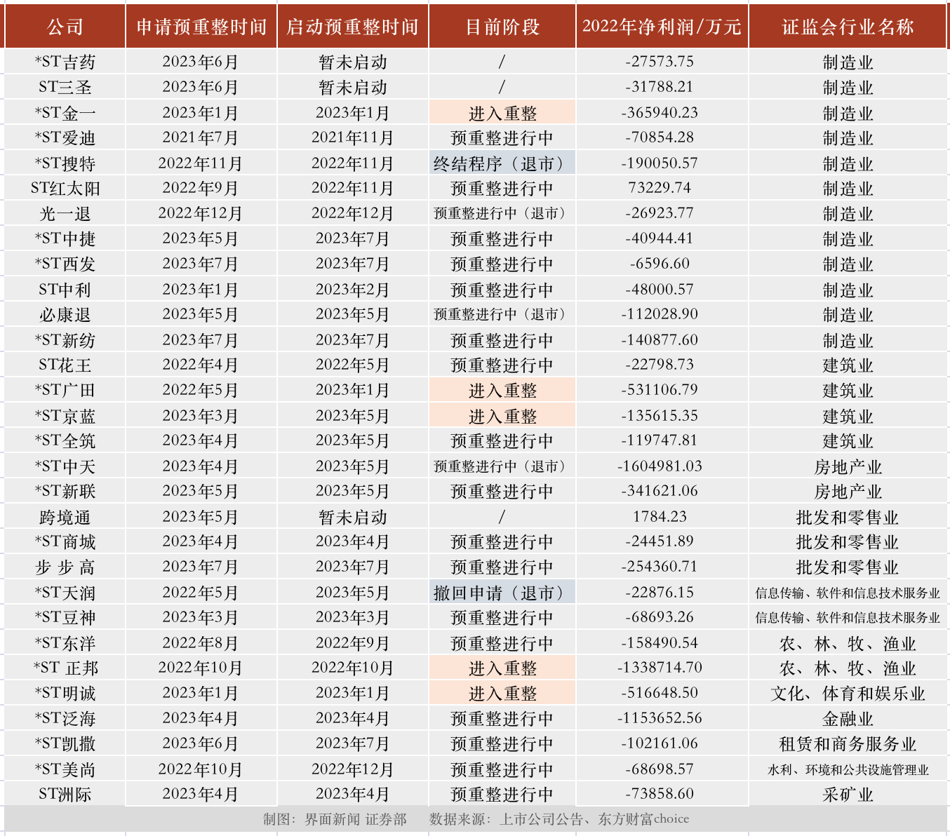 此外,*ST广田(002482.SZ)、*ST明诚(600136.SH)、*ST金一(002721.SZ)三家公司均在今年1月启动预重整,目前已经转重整程序,*ST正邦在去年10月启动预重整,于今年7月进入正式重整。
