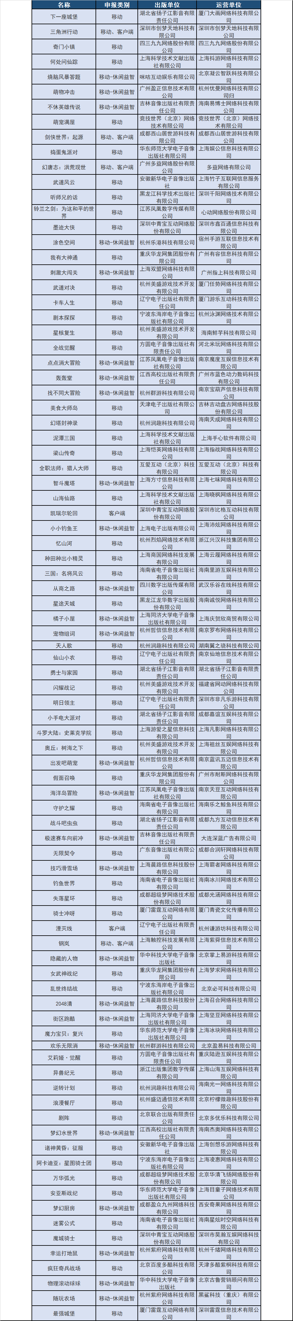 本批过审名单中出现了西山居《剑侠世界:起源》、多益网络《幻唐志:洪荒现世》、心动网络《铃兰之剑:为这和平的世界》、中手游《斗罗大陆:史莱克学院》、紫龙游戏《钢岚》、恺英网络《梁山传奇》、四三九九《奇门小镇》、互爱互动《全职法师:猎人大师》、冰川网络《钓鱼世界》、雷霆互动《骑士冲呀》、《最强城堡》、柠檬微趣《浪漫餐厅》、百度多酷《疯狂骑兵战场》等游戏产品。