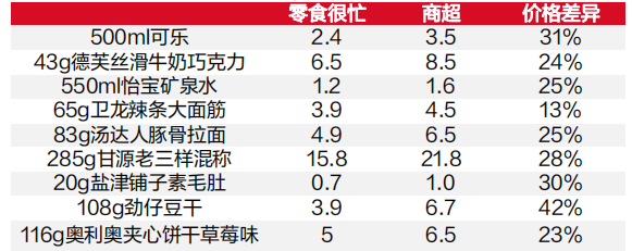 通过大批量采购、不收取渠道费用等手段压低出厂价格,保证产品在终端的价格竞争力。向加盟店供货环节毛利率在5-10%,从出厂价至终端加价率约为25%,效率提升明显。经过渠道调研,零食很忙量贩店的价格比商超价格便宜30%左右。