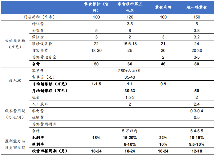 与其他线下连锁加盟业态类似,从头部品牌零食很忙、零食有鸣的单店模型来看,零食量贩店的回报周期多数在18-24个月,与连锁卤味品牌的投资回报期相近。一般单店日销为1.2万左右,毛利18%-22%,扣除租金及人工费用等约3-4万后,单店单月盈利约2-3万左右,门店净利润率约为5%-7%。