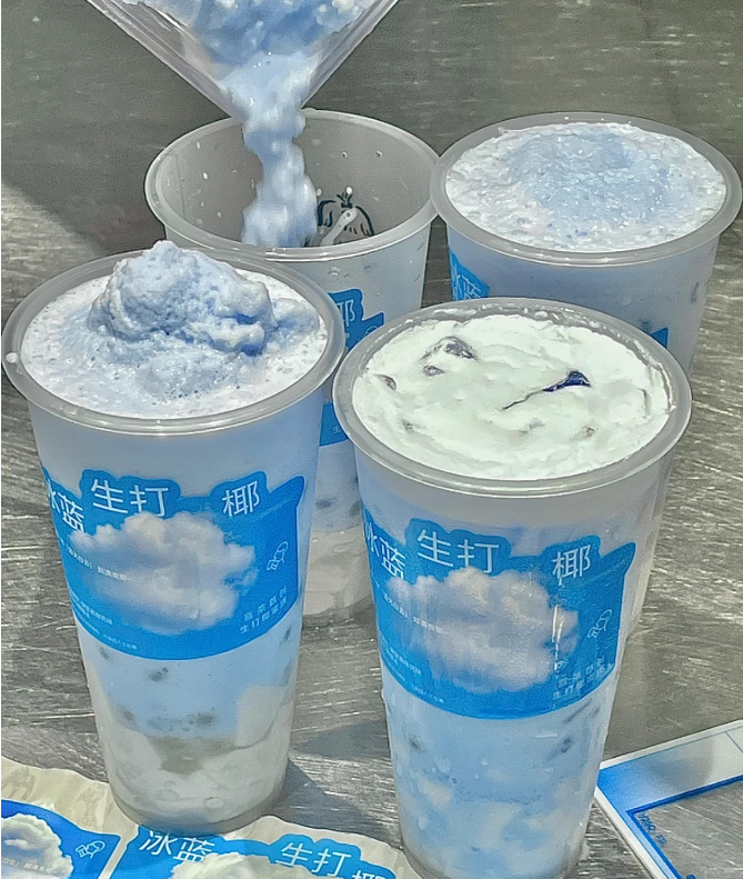 比如蔻蔻椰的粉椰芭乐用芭乐的粉色丰富椰子水的透明,秋季上市的柿子饮品用橙红色颜色呼应秋季丰收的喜悦和热情,冰蓝生打椰在一杯饮料里看到蓝天白云。先以颜值吸引,再用味道打动,成功圈住消费者。