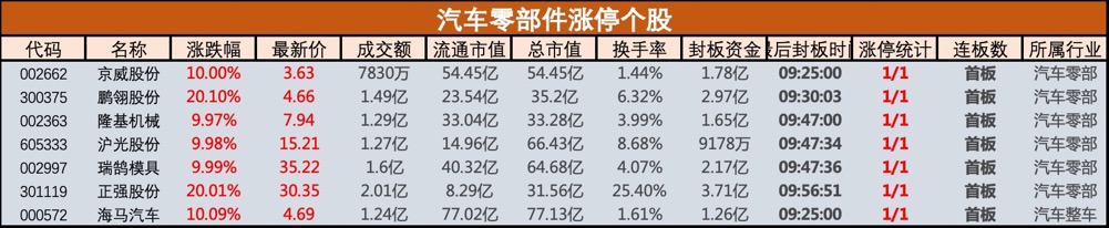 7月27日,汽车零部件开盘走强,鹏翎股份(300375)、正强股份(301119)20cm涨停,京威股份(002662)、隆基机械(002363)、沪光股份(605333)、瑞鹄模具(002997)、海马汽车(000572)多股封板。