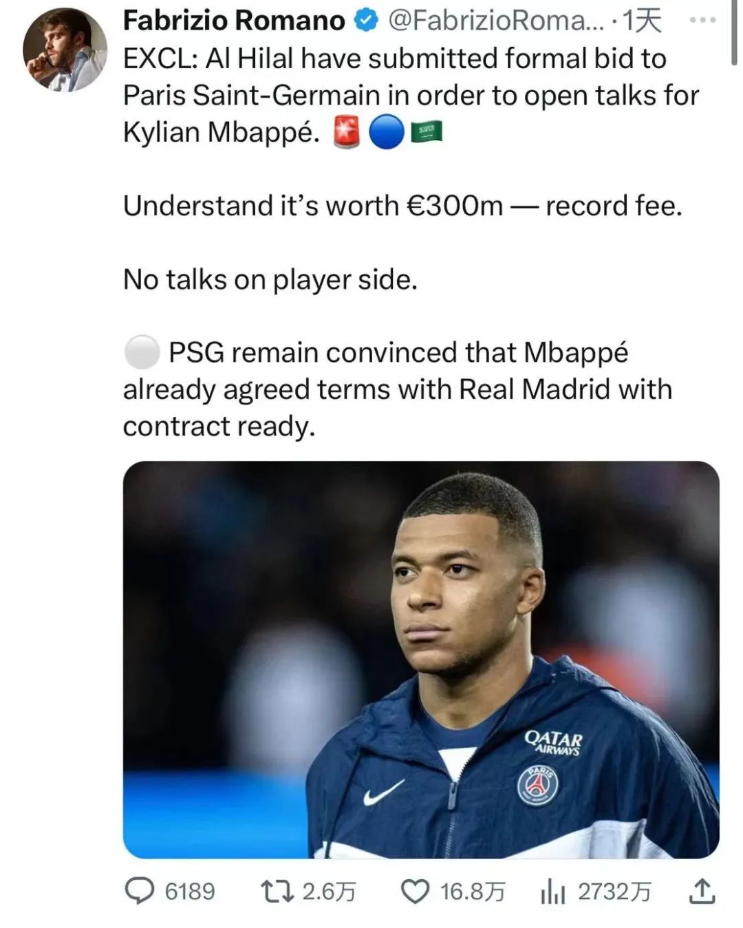 北京时间7月25日,知名记者罗马诺通过个人社媒爆出沙特联赛球队利雅得新月3亿欧元报价巴黎球星姆巴佩,与此同时,还有消息称沙特方面准备向姆巴佩提供7亿欧元年薪,并承诺如果球员本人愿意,之后可以以自由身加盟皇马。