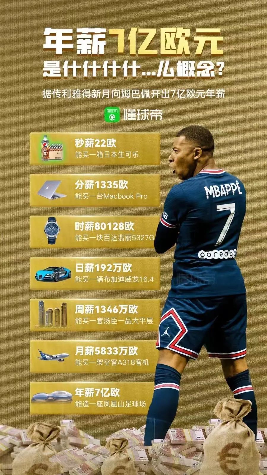 根据多方消息源汇总,这份合同实际上是沙特公共投资基金负责支出,其中包含了为姆巴佩提供税后2亿欧元年薪,并通过参加沙特方面安排的商业活动,使其最高收入可达7亿欧元。