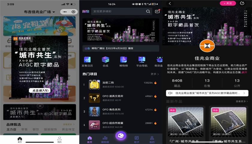 在纷享佳7·18宠粉节活动期间,佳兆业商业携手奥雅芊熹科技及国内领先PFP数字原生IP平台“稀物”APP,首发未来感十足的“城市共生”系列AIGC数字藏品,链接线下实体权益,提升购物体验,实现营销闭环,并以高辨识度品牌DNA,与年轻潮流群体同频,为商业运营无限赋能。