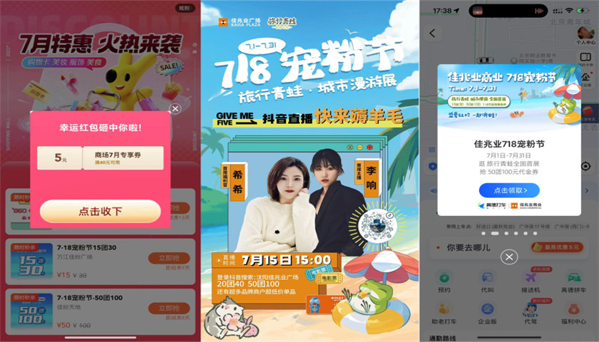 佳兆业商业以创新的数字化运营理念,结合项目在地文化及资源属性,从公域获取流量导流到私域,实现“全触点营销”,在商业地产领域开启了一种全新的会员触达、销售转化、复购裂变的运营模式。据悉,“纷享佳7•18宠粉节”期间,与美团、大众点评以及抖音、高德、T3等多方流量平台的合作,最终实现曝光量超8000万、近300万线上销售,带动线下千万消费力。