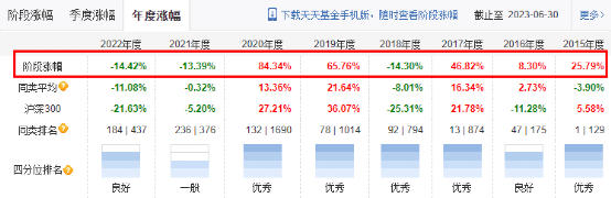 2021年、2022年易方达优质精选年度收益分别为-13.39%、-14.42%,均录得超过10个点的亏损。