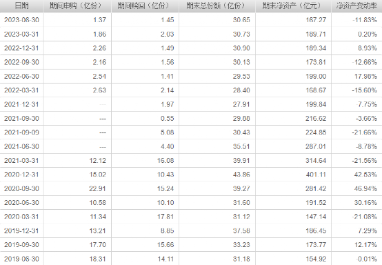 到了2023年6月末,这只产品资产规模已经下降至167亿元,较上述历史峰值缩水幅度高达58%。最新基金总份额为30.65亿份,低于4年前同期总份额,可见投资者离场的程度。