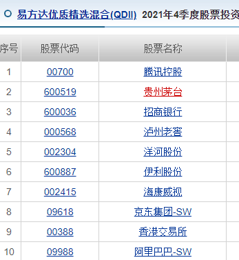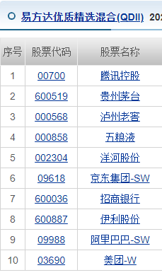 如下图,其最新前十大重仓股依次为:腾讯控股、贵州茅台、泸州老窖、五粮液、洋河股份、京东集团、招商银行、伊利股份、阿里巴巴和美团。