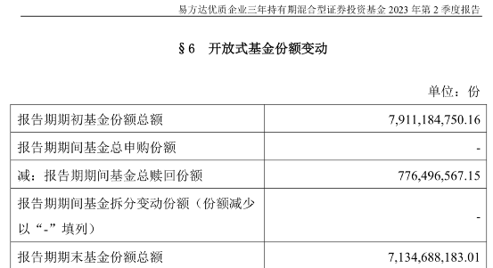 二季报披露:期间总赎回份额为7.76亿份,报告期末总份额仍有71.35亿份。