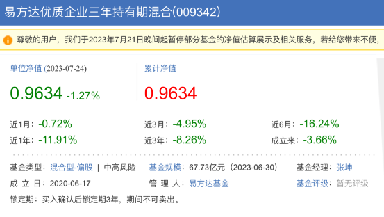 今年7月24日,这只产品的单位净值跌破了1元面值,为0.9634,“铁粉”够难受的了。