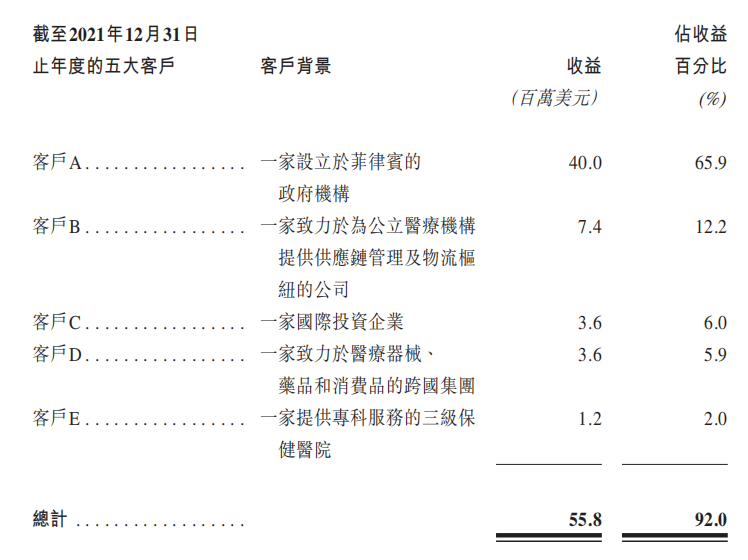 2021年至2023年前4个月,觅瑞前五大客户收入占比分别为92.0%、42.7%、43.7%。其中,2021年第一大客户是一家设立在菲律宾的政府机构,当年对觅瑞的采购额为4000万美元,收入占比为65.9%。