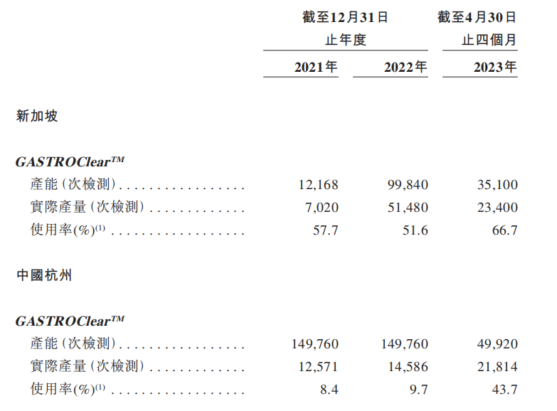 根据招股书,2021年和2022年及2023年前4个月,GASTROClearTM在新加坡的使用率分别为57.7%、51.6%、66.7%,在中国杭州的使用率分别为8.4%、9.7%、43.7%。2023年,该试剂使用率在中国杭州大幅提升,但仍低于新加坡地区。