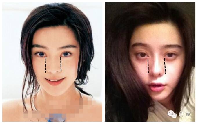 说实话范冰冰原本的鼻头和鼻翼并不丑,为什么还要再弄得更精致些呢?原因可能在于范冰冰开了一个长长的内眼角,两眼间距拉近。