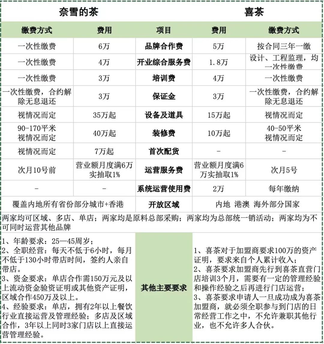 在奈雪的茶此次公布的合伙人合作要求中,大部分条件与此前喜茶公布的合伙人要求基本相同。但比喜茶更为严苛的是:喜茶对流动资金的验资证明金额要求为100万,而奈雪的茶则要求单店合作150万、区域合作450万的验资证明。