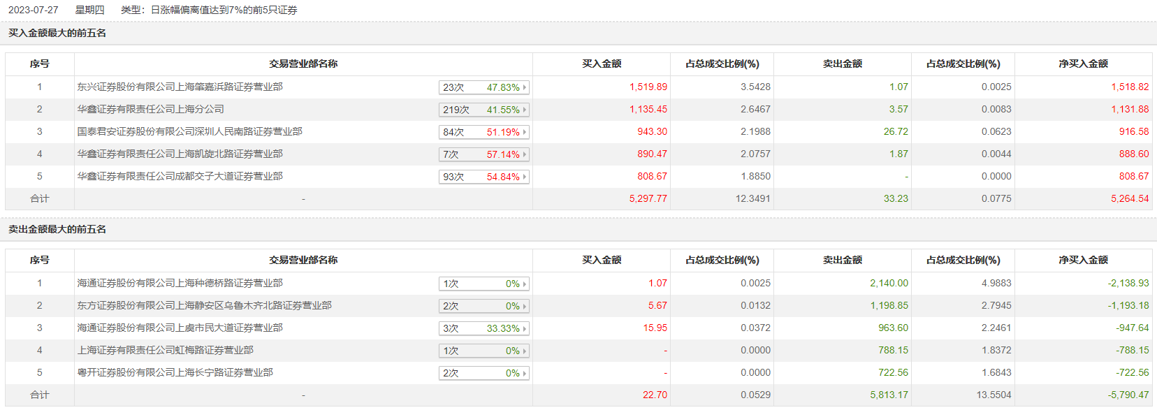 具体来看,东兴证券上海肇嘉浜路证券营业部、华鑫证券上海分公司分别买入1519.89万元、1135.45万元;海通证券上海种德桥路证券营业部、东方证券上海静安区乌鲁木齐北路证券营业部分别卖出2140.00万元、1198.85万元。