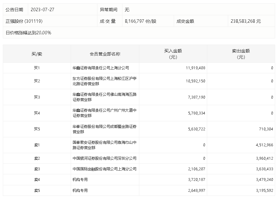 7月27日,正强股份今日涨停,龙虎榜数据显示,上榜营业部席位全天成交6928.21万元,占当日总成交金额比例为29.04%。其中,买入金额为4978.52万元,卖出金额为1949.69万元,合计净买入3028.82万元。