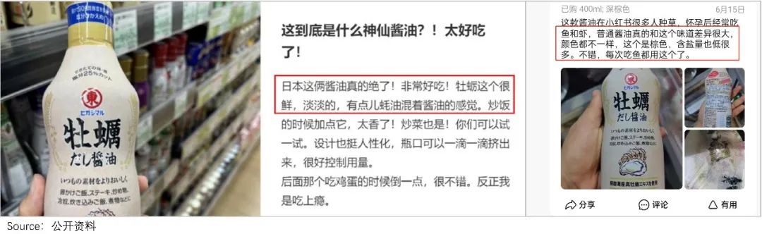 以一款日本的东字牡蛎酱油为例,淘宝上价格20+,但小红书和淘宝评价很多反馈说“吃了之后,就回不到普通酱油了”。