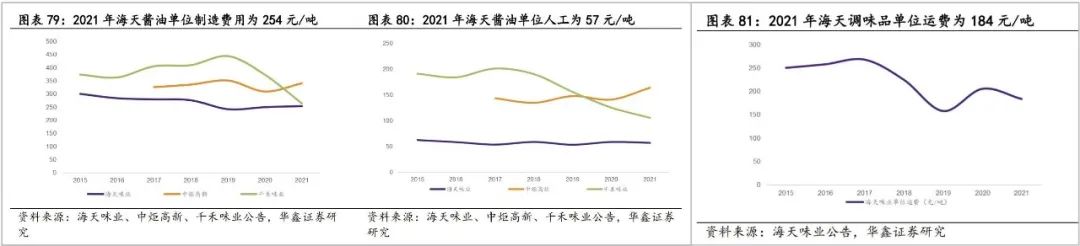 如此以供给扩张匹配需求,持续放大了海天的规模效应——单位制造费用和人工成本都低于竞对,单位运费持续下降。