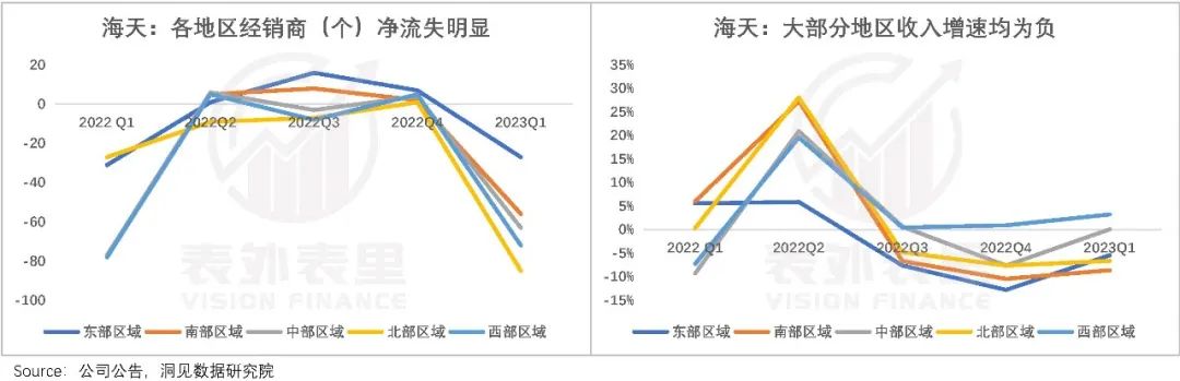 就在这些增长区域,海天这个全国性品牌,所属的经销商数量却在全方位下滑,中、北部地区是重灾区,对应地区的收入也呈现下滑趋势。