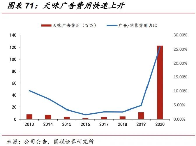 天味则主打“钞能力”,2018-2020年广告营销费用3年CAGR为81.60%。其中,广告费用主要用于复合调味品牌好人家的广告投放。