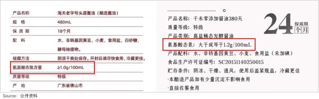 对比同样的特级零添加产品可以看到,千禾在完全无添加情况下,氨基酸态氨含量达到1.2g/100mL;海天添加了酵母抽提物,含量也仅有1.0g/100mL。