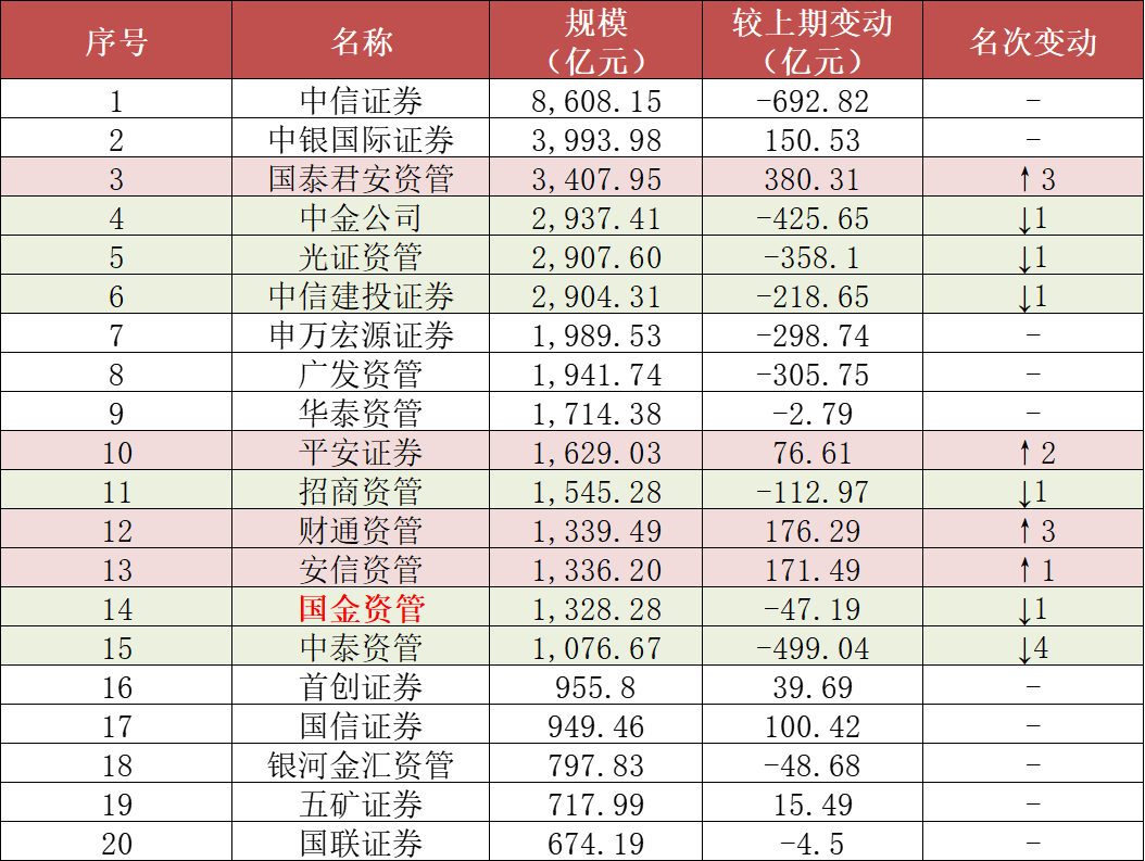 具体看前二十强名单,二季度上榜名单全部由老选手撑起,但国金资管替代国金证券首次上榜,二季度券商资管子机构名单扩充1位。