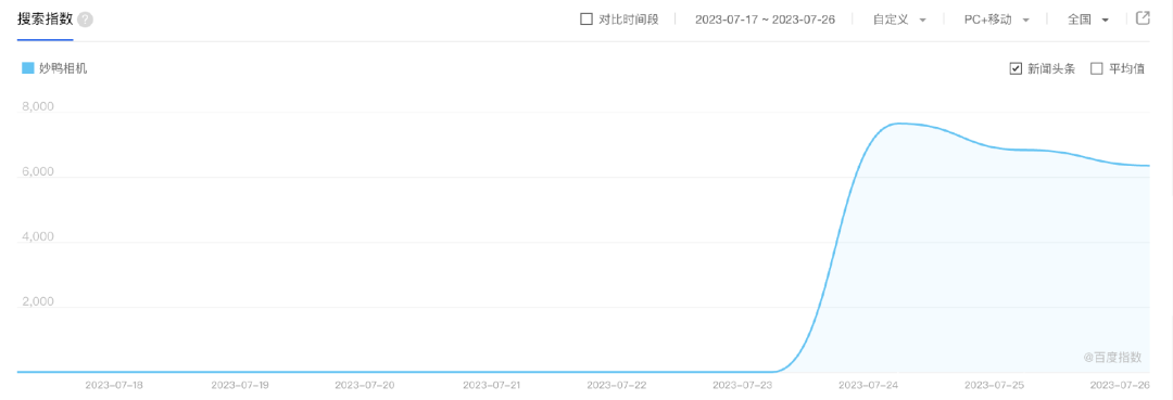 微信指数显示,妙鸭相机在7月17日上线后的四天内,指数一直很低,第五天开始上升,在7月25日达到峰值,但从7月26日开始,指数便扭头向下大幅下滑。它的热度,也就维持了大概一周时间。